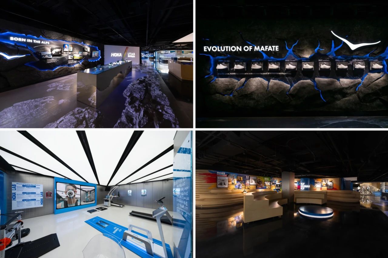 In the basement museum, cutting-edge motion imaging brings the Alps’ seasonal changes to life, aligning with the “Mountain Wall” that maps HOKA’s origins and development. Further in, visitors can explore the evolution of the iconic MAFATE trail shoe and its three core technologies. This thorough deconstruction of the brand’s trail-running legacy leaves a lasting impression on visitors.